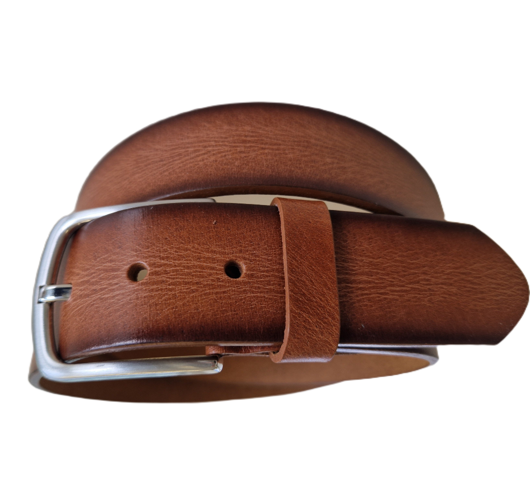 100% Leder, offenkantig, kürzbar, 4.0 cm breit. Schliesse alt-silber, nickelfrei, Bundweiten 85-125 cm, Farbe 64 cognac