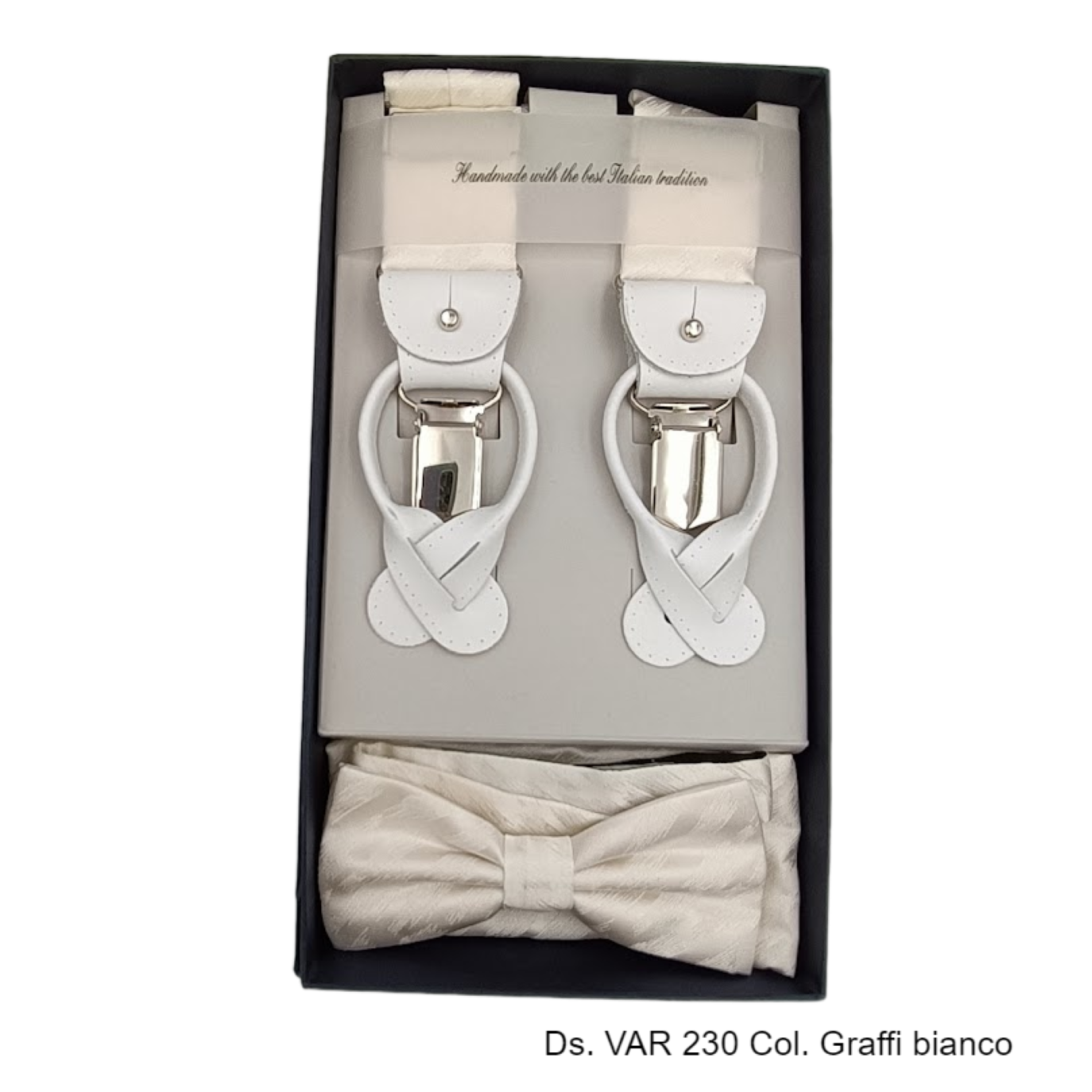 Button-Hosenträger SET (inkl. Mäschli und Pochette) Edel-Weiss, Ds. VAR-230, 3.5 cm breit mit 3 Clips und 3 Lederschlaufen zum Knöpfen, Grösse 110 cm